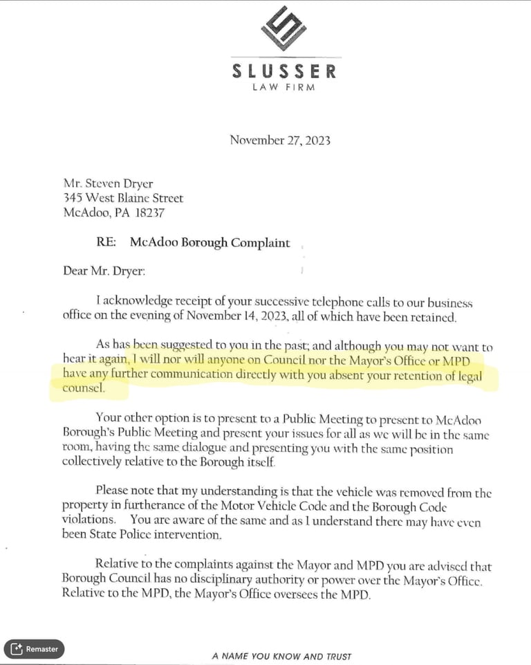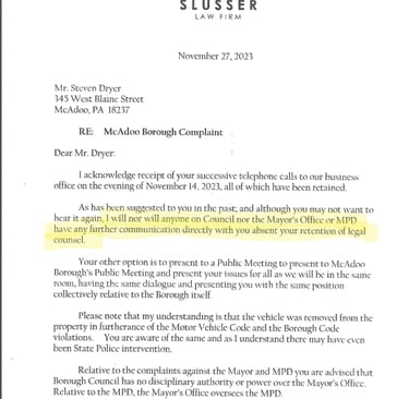 In one of the last communications from the all-powerful Solicitor Baranko, I was warned that I violated both the motor vehicle code and McAdoo code; presumably, he's referring to the Quality of Life Ordinance.