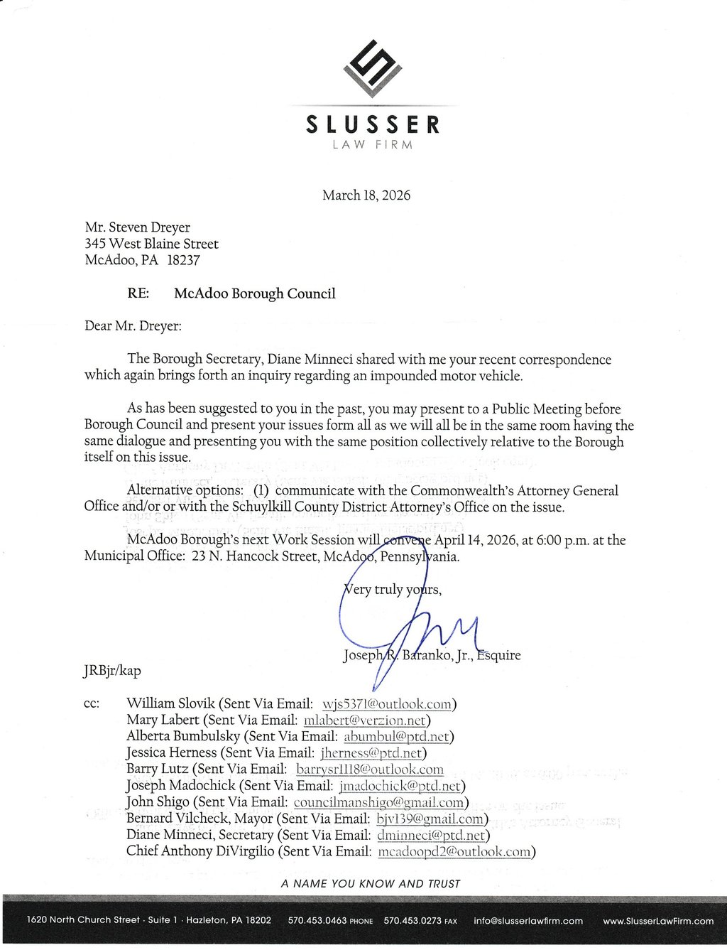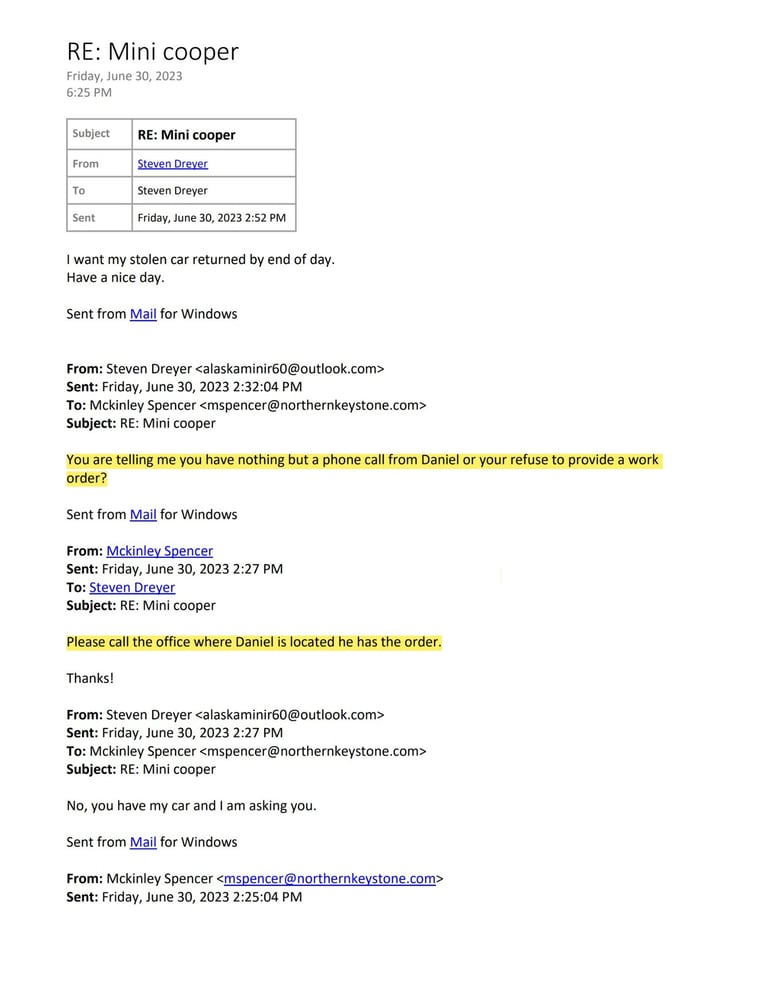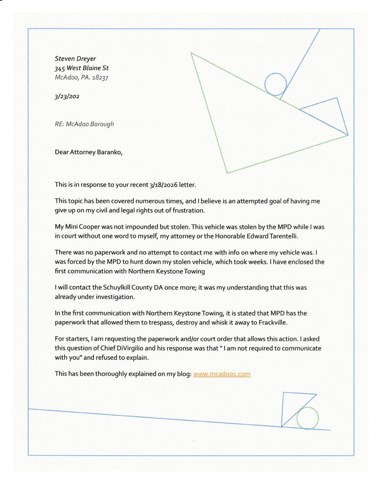 Another letter from Baranko ignoring all the facts presented encouraging me to plea my case in front of the very people that stole my Mini. This tactic is designed for the poor that cannot afford legal help. Drag this out for years so you give up hope on your civil rights.